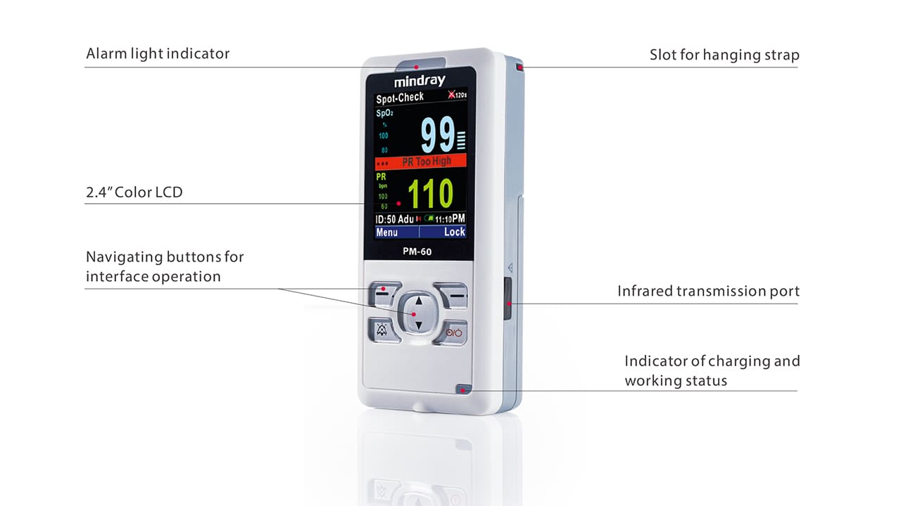 PM-60 is a miniature, lightweight device capable of spot-check and continuous monitoring of SpO2 and pulse rate. You determine the capabilities and performance, depending on the operational mode you choose. For simple vital signs checks, spot-check mode offers basic functions including auto-assign of patient IDs, alarm suppression state and auto-standby and power-off features. For longer-term monitoring, continuous mode offers manual entry of unique patient IDs, alarm management and pleth waveform display. If pulse oximetry varies from day to day, or perhaps hour to hour, PM-60 is ideal as your device of choice.